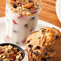 Low-Fat Vanilla Yogurt and Seasonal Fruit topped with our Honey Granola mix of Almonds and Dried Fruit.